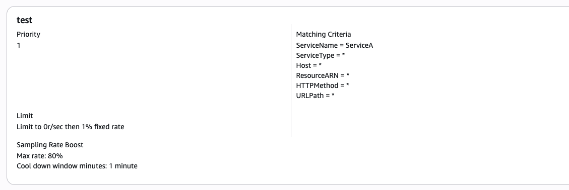 Sampling rule for the root service: The following JSON shows the test sampling rule that is configured for Service A. The console view is shown in figure 2 and figure 3 below.