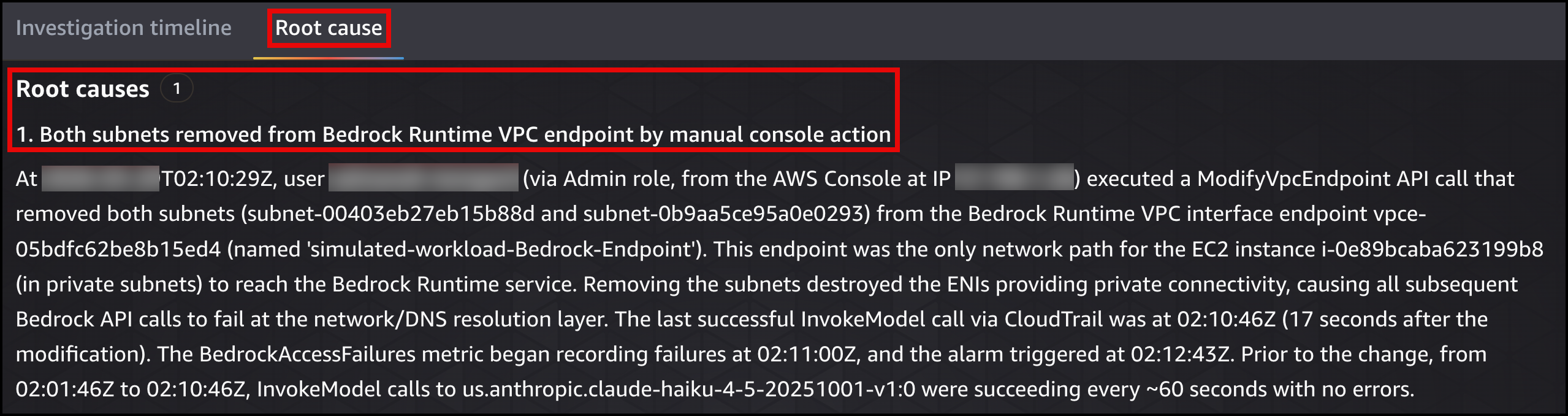 - Identifies root cause – Both subnet associations were removed from the Bedrock Runtime Interface VPC Endpoint, deleting the ENIs that handle traffic while the endpoint itself remained in an “Available” state.