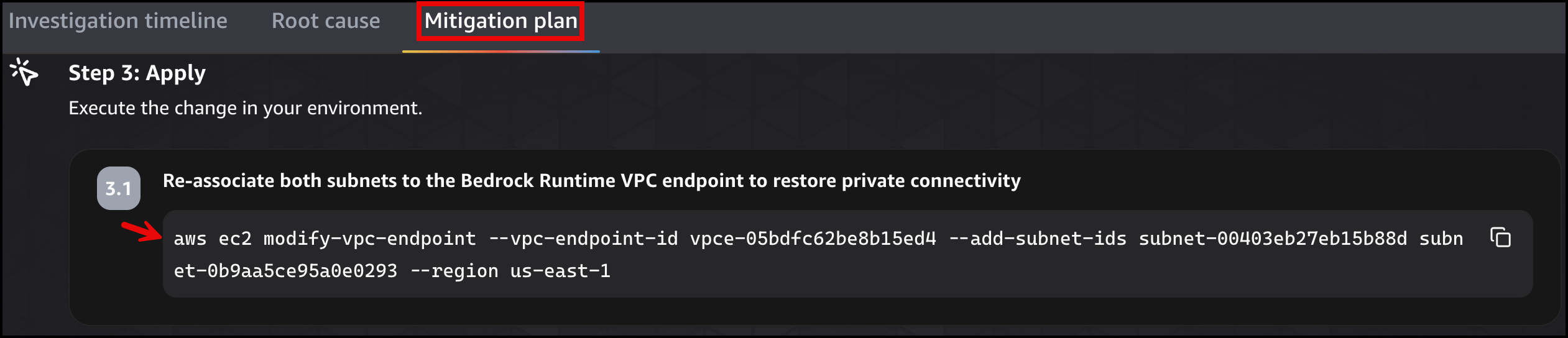 Figures 23 and 24 display the investigation timeline and root cause tabs. After reviewing the root cause, you can generate a mitigation plan to see how to resolve the issue. Figure 25 shows the mitigation plan detailing the steps (AWS CLI Command) needed to restore the Bedrock Runtime Interface VPC Endpoint.