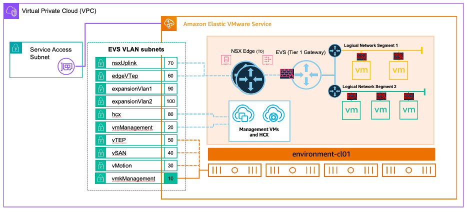 As organizations look to accelerate their cloud migration journey, many customers are seeking ways to lift and shift their existing VMware workloads to Amazon Web Services (AWS) without the overhead of refactoring applications or retraining staff. You can use Amazon Elastic VMware service (Amazon EVS) to run VMware Cloud Foundation (VCF) directly within your Amazon Virtual Private Cloud (VPC), providing the fastest path to migrate and operate your VMware workloads on AWS.