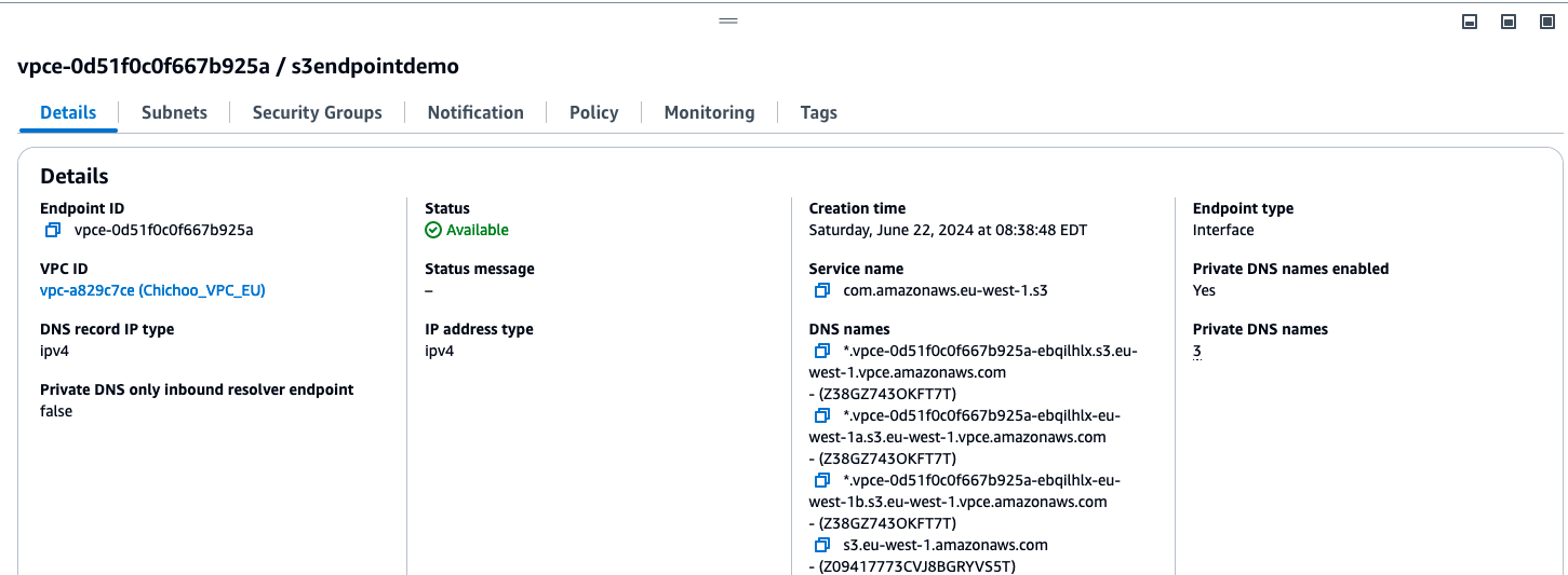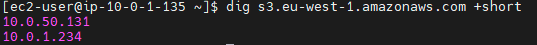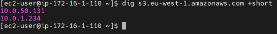 When a DNS resolution is conducted against the Amazon S3 Regional DNS name in Ireland (s3.eu-west-1.amazonaws.com) from an instance within the Region where the endpoint resides (eu-west-1), it resolves to the private IP addresses as depicted in the following figure. This validates that private DNS is enabled, as Route 53 Resolver is updated with private IP addresses for the Amazon S3 interface endpoint.