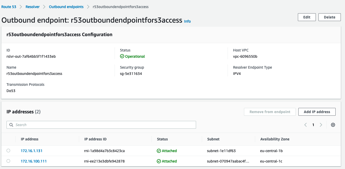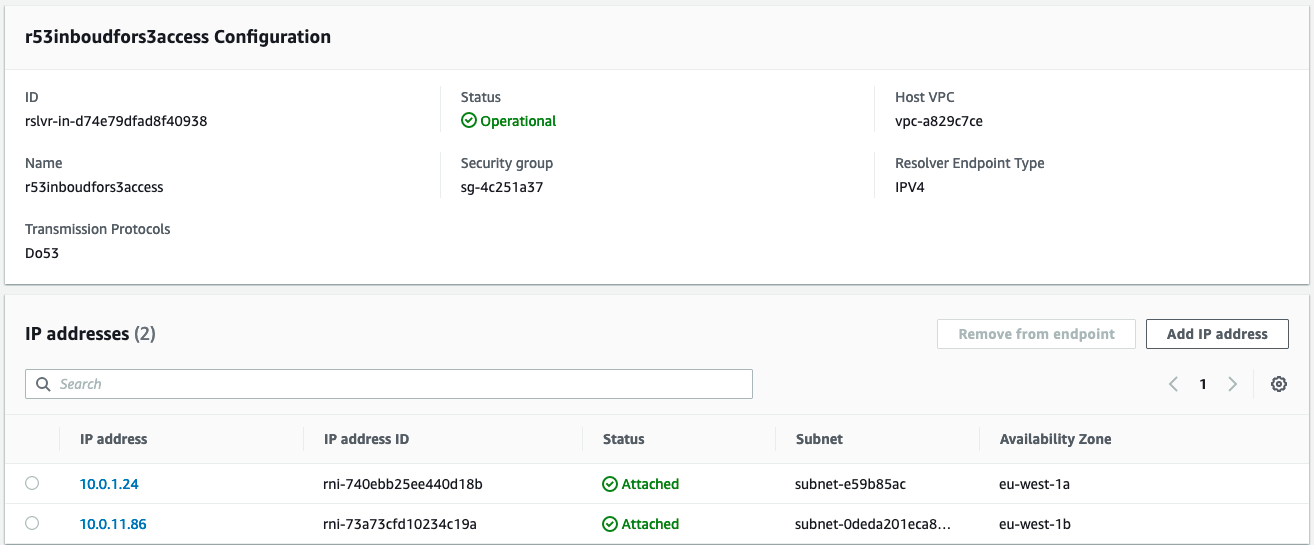 Referencing Figure 1, a Route 53 Resolver inbound endpoint is created in the remote VPC in the Ireland Region (eu-west-1) containing the Amazon S3 interface endpoint. The following figure details the inbound endpoint IPs that accept DNS queries from remote sources, in our example the VPC in the Frankfurt Region (eu-central-1).