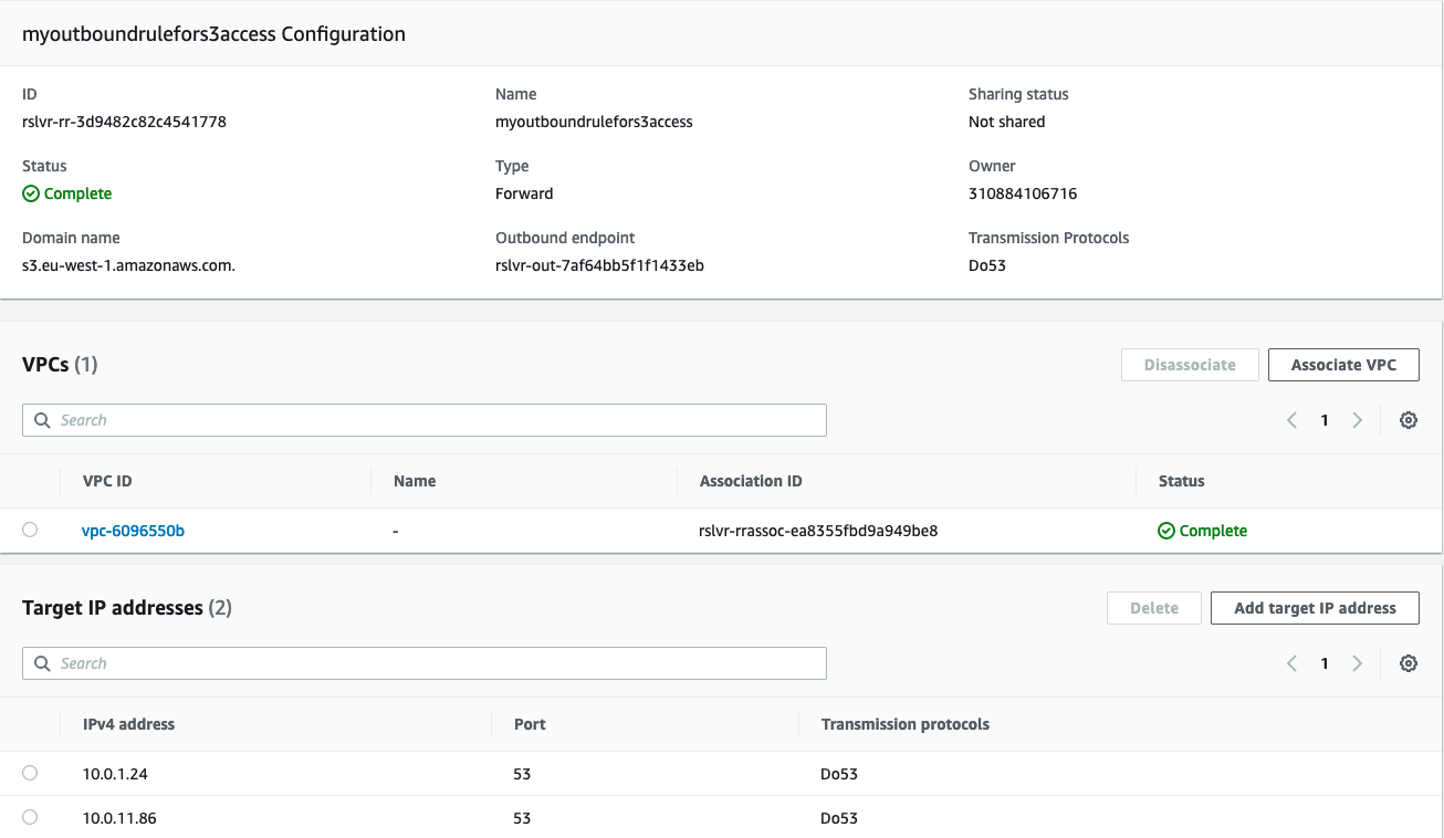 The following figure details the Route 53 Resolver rule matching the remote resource (s3.eu-west-1.amazonaws.com) and the target IP addresses to forward DNS queries to.