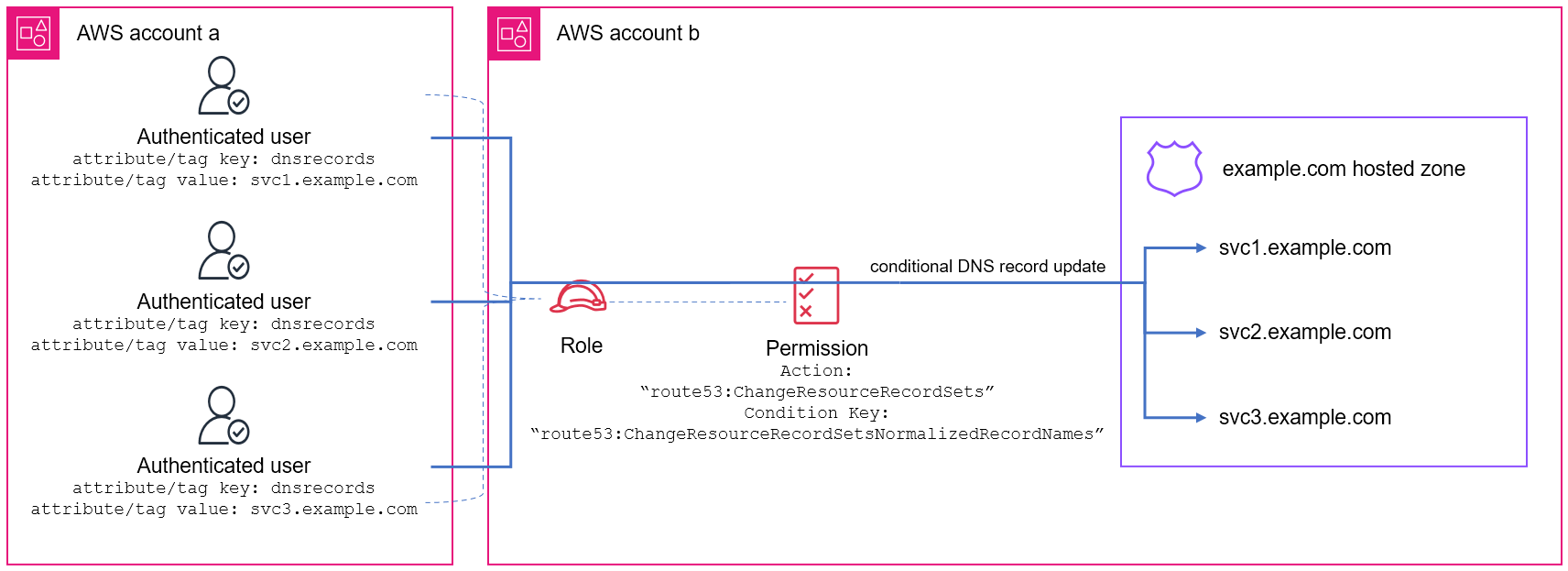 The example uses the value in the dnsrecord custom attribute of the IAM user to grant conditional access to update the DNS records ending with the .svc1.example.com domain suffix in the shared hosted zone example.com used in a different account.