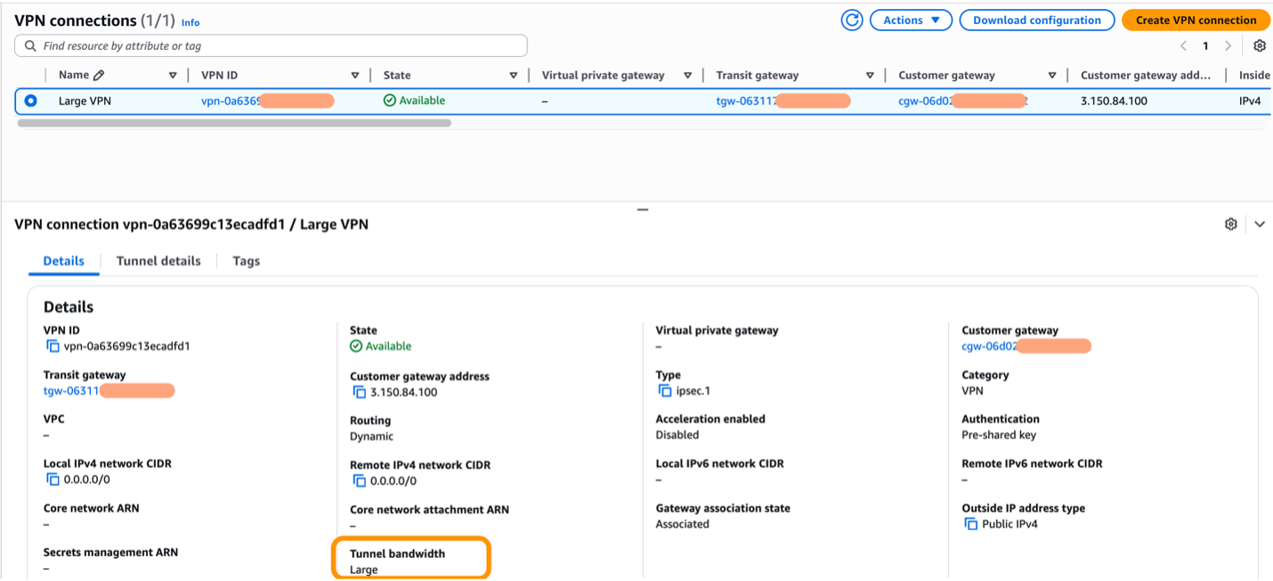 Figure 3: VPN Connection details page highlighting the Tunnel Bandwidth configuration