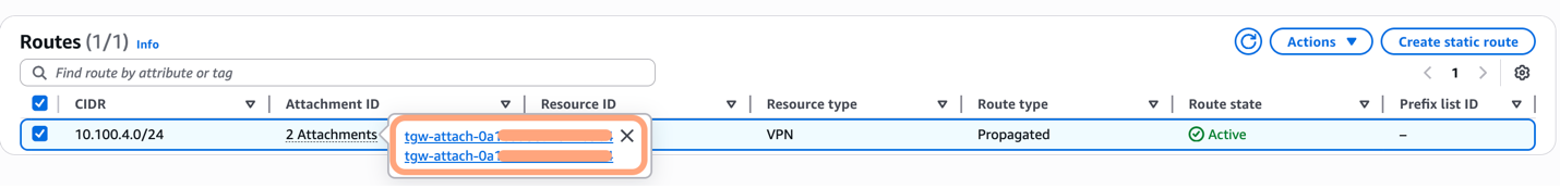 The AWS Transit Gateway route table will show the attachments for same destinations. This configuration is similar to Standard VPN.