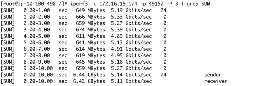 The following traffic tests show the throughput observed with one tunnel. While the sustained maximum throughput is 5 Gbps, you may notice some burst of higher than 5 Gbps as seen in the testing results.