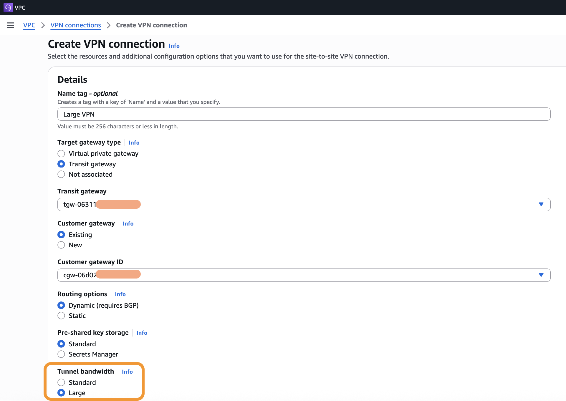 The VPN configuration now has the option to select Tunnel Bandwidth as Standard or Large. The default configuration is Standard, which is the same as the existing mode and provides maximum 1.25 Gbps per tunnel capacity. You can choose the Large configuration to use higher per tunnel bandwidth of 5 Gbps. Ensure your Customer Gateway (Firewall/VPN appliance) and Internet connection support higher throughput.