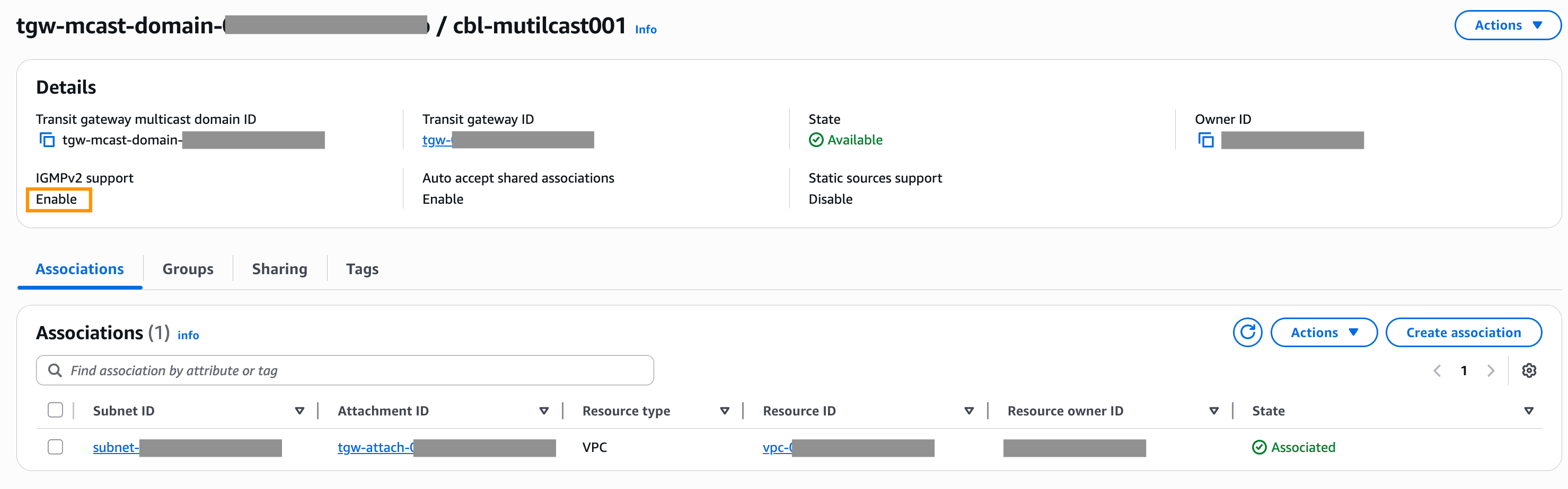 Create a Transit Gateway and attach the prepared VPC to it. Then, use the Transit Gateway to create an IGMP multicast domain, and associate the planned multicast subnet with the multicast domain to build the basic multicast environment. For detailed instructions on how to create an IGMP Domain using Transit Gateway, refer to the Create an IGMP multicast domain in AWS Transit Gateway documentation. Figure 2 shows an example of the created IGMP multicast domain using Transit Gateway: