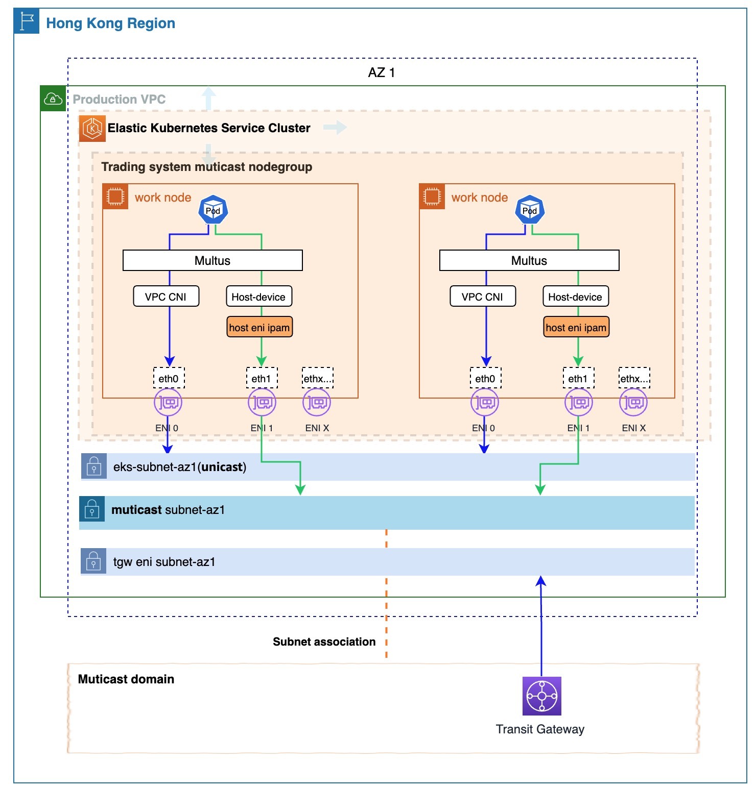 In this post, we introduce an Amazon EKS multicast communication solution, built upon AWS Transit Gateway, that provides multicast capabilities to EKS clusters by adding extra ENIs, without impacting the Amazon VPC CNI plugin. This solution removes the obstacles for Huatai Securities to deploy their containerized core trading systems on AWS. Furthermore, it offers valuable insights for other users who need multicast capabilities in scenarios where VPC CNI is the primary network plugin. This solution significantly benefits Huatai Securities by reducing bandwidth utilization and delivering a 10-fold improvement in latency for their trading operations.Try our solution to improve the network processing efficiency of your system, or read the Transit Gateway multicast feature to build your own solution.