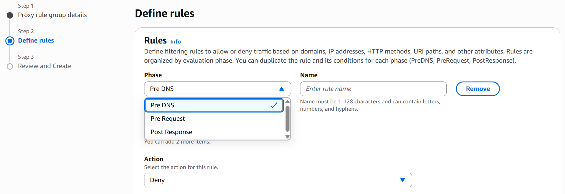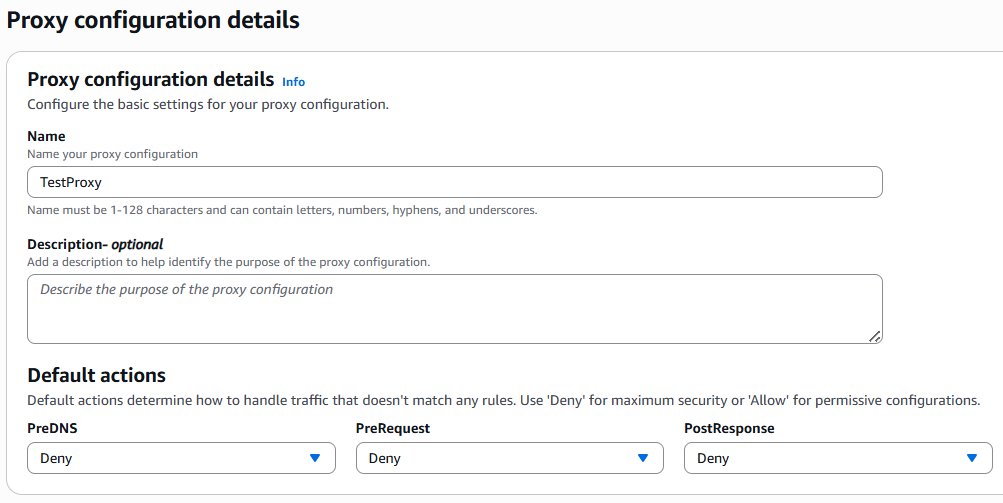 You can consolidate the different rule groups in a single Network Firewall proxy configuration. When you create a proxy configuration, you must select the default action for each phase. The default action is applied when none of the rules in any of the rule groups match the traffic.