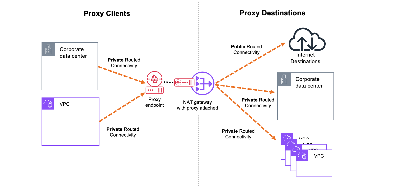 This model uses the NAT Gateway in two distinct modes. First, it receives routed traffic that has already been inspected by AWS Network Firewall (or another gateway-mode security solution using Gateway Load Balancer). This routed traffic is not proxied. Separately, the NAT Gateway also receives proxied traffic forwarded by the proxy, which in turn receives that traffic through endpoints from multiple VPCs. Only the traffic that arrives through the proxy endpoint path is subject to proxy functionality.