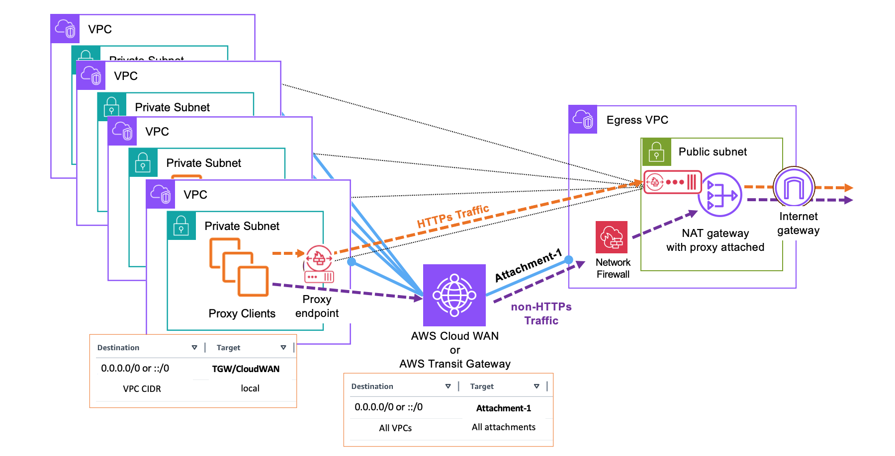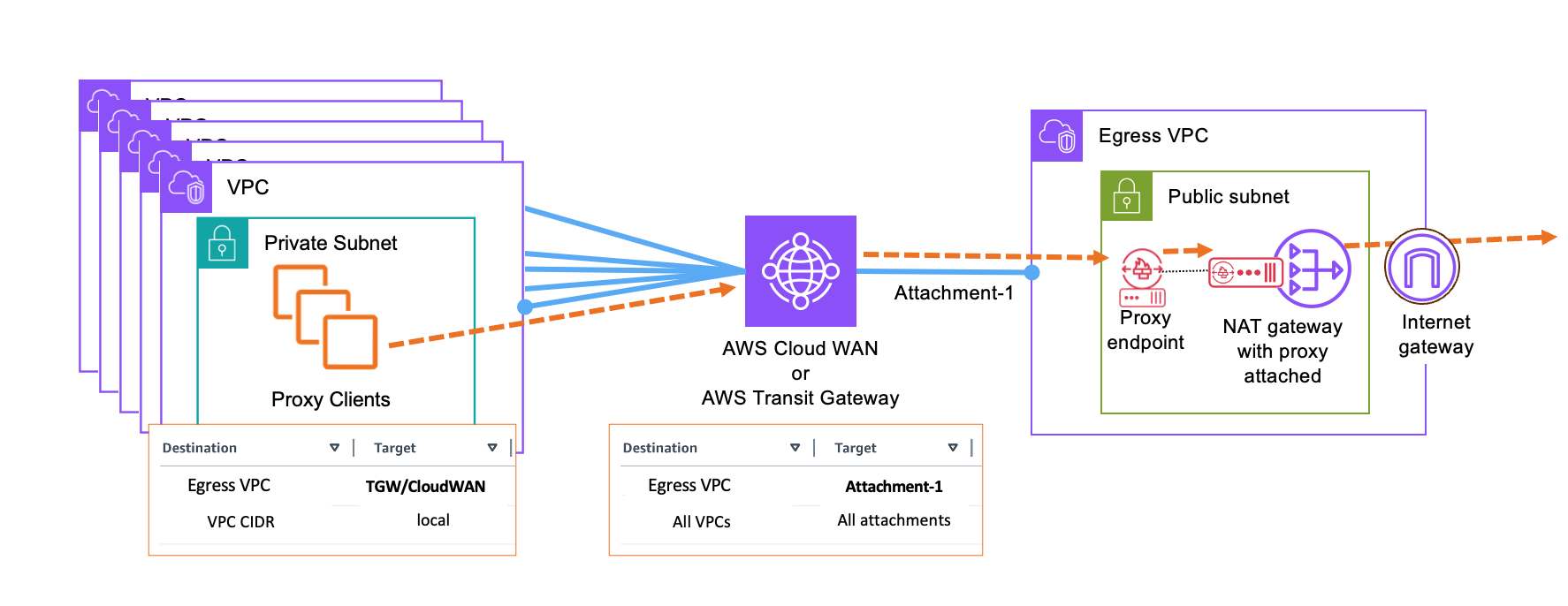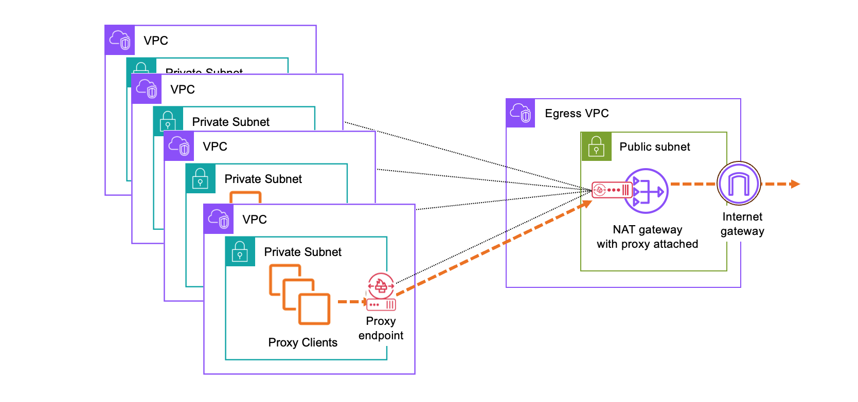 Customers would typically prefer a centralized model to optimize costs and better utilize the NAT Gateways and proxy. In a centralized model, you can share a single NAT Gateway and proxy across multiple VPCs by exposing them through a proxy Endpoint. Alternatively, you can use a networking construct such as AWS Transit Gateway or AWS Cloud WAN to route traffic from multiple VPCs to a central proxy endpoint.