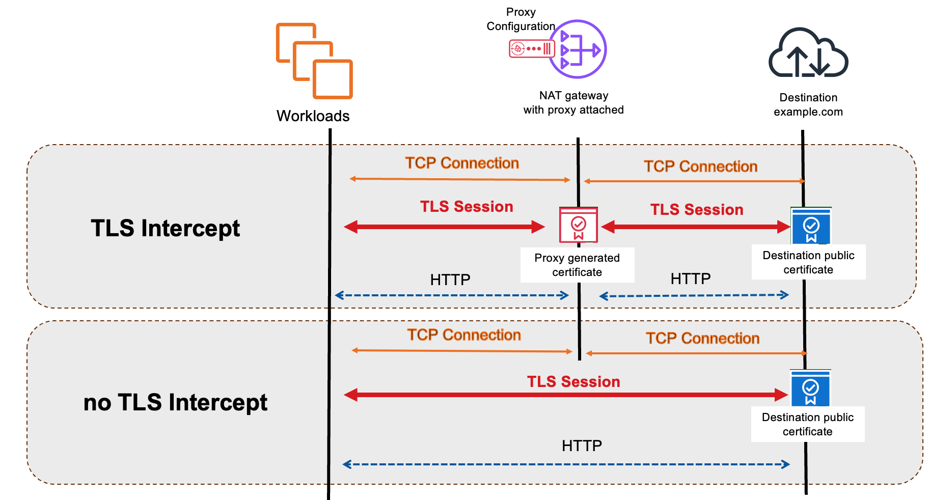 Network Firewall’s proxy can be configured to either intercept TLS or allow TLS to pass through untouched. When TLS interception is enabled, the proxy terminates the TLS session from the workload and initiates a new TLS session toward the destination. To do this, the proxy generates a certificate on behalf of the real destination and presents it to the workload. For this to work, the workload must trust the proxy’s certificate authority; the process for establishing that trust is covered in a later section. With interception enabled, the proxy can inspect HTTP-layer content and apply fine-grained policies.