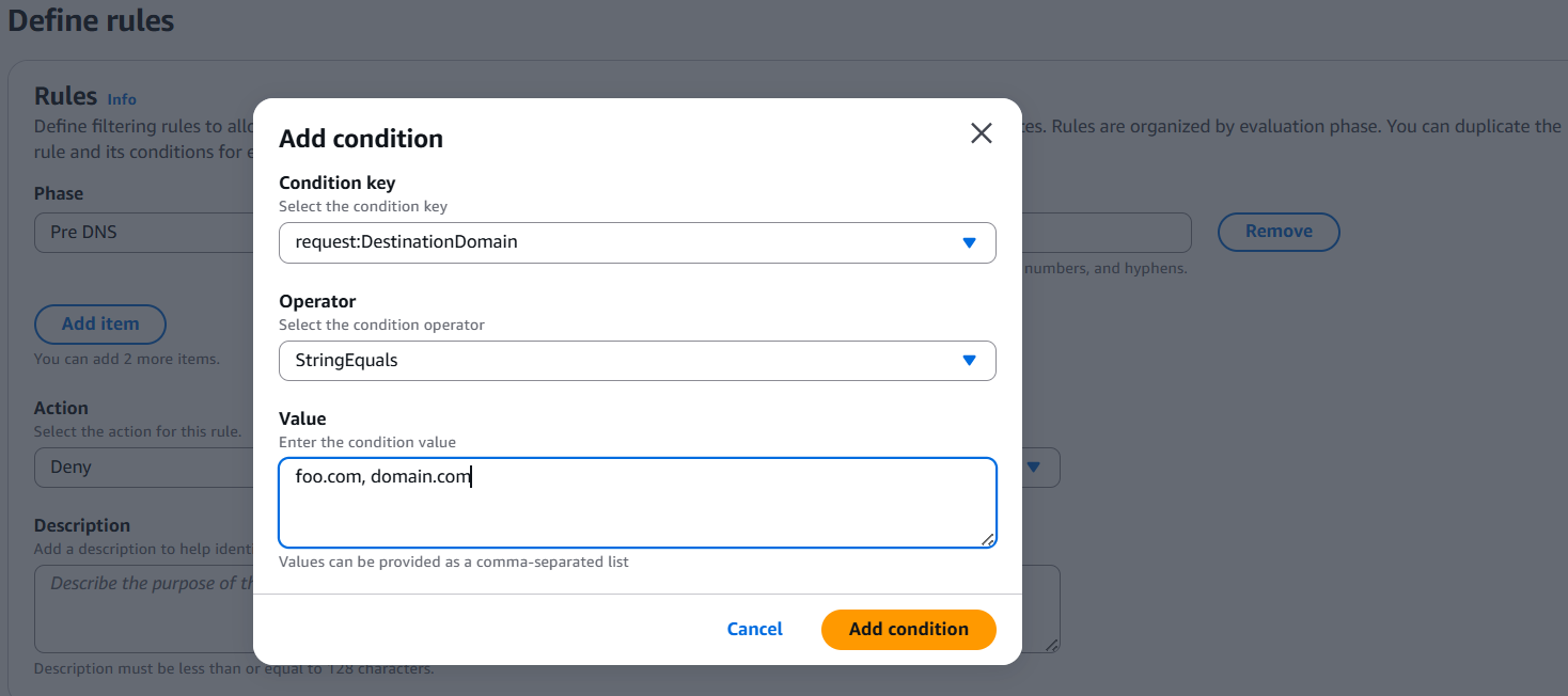 You can choose to create multiple match conditions for a single rule. Refer to the documentation for details on condition key options and examples of filtering rules. The rule is only implemented if all the conditions are matched. You can use these conditions to create fine-grained and source-specific rules. Once you have defined the match conditions, you can choose the action – allow, deny or alert – and create the rule.