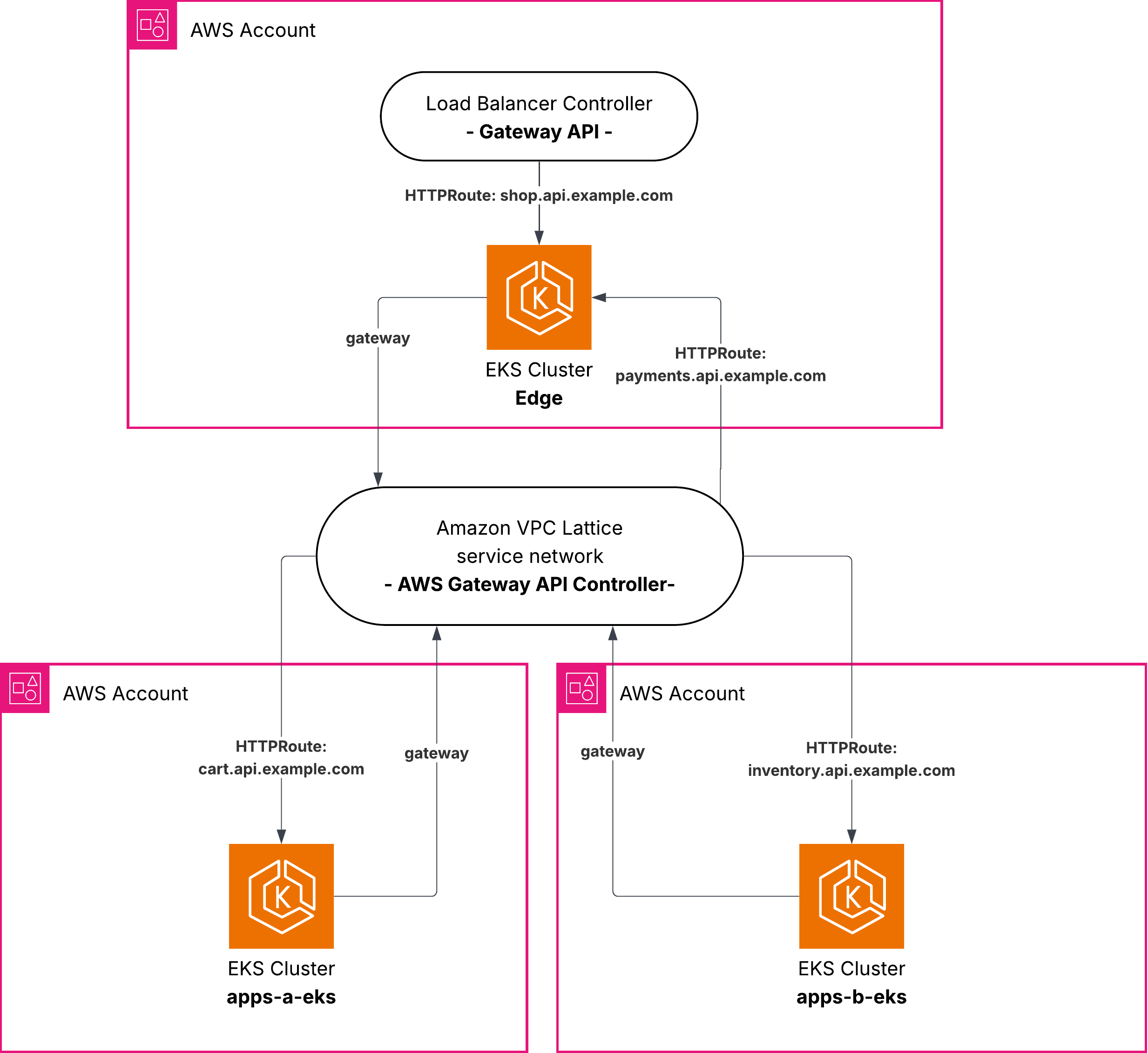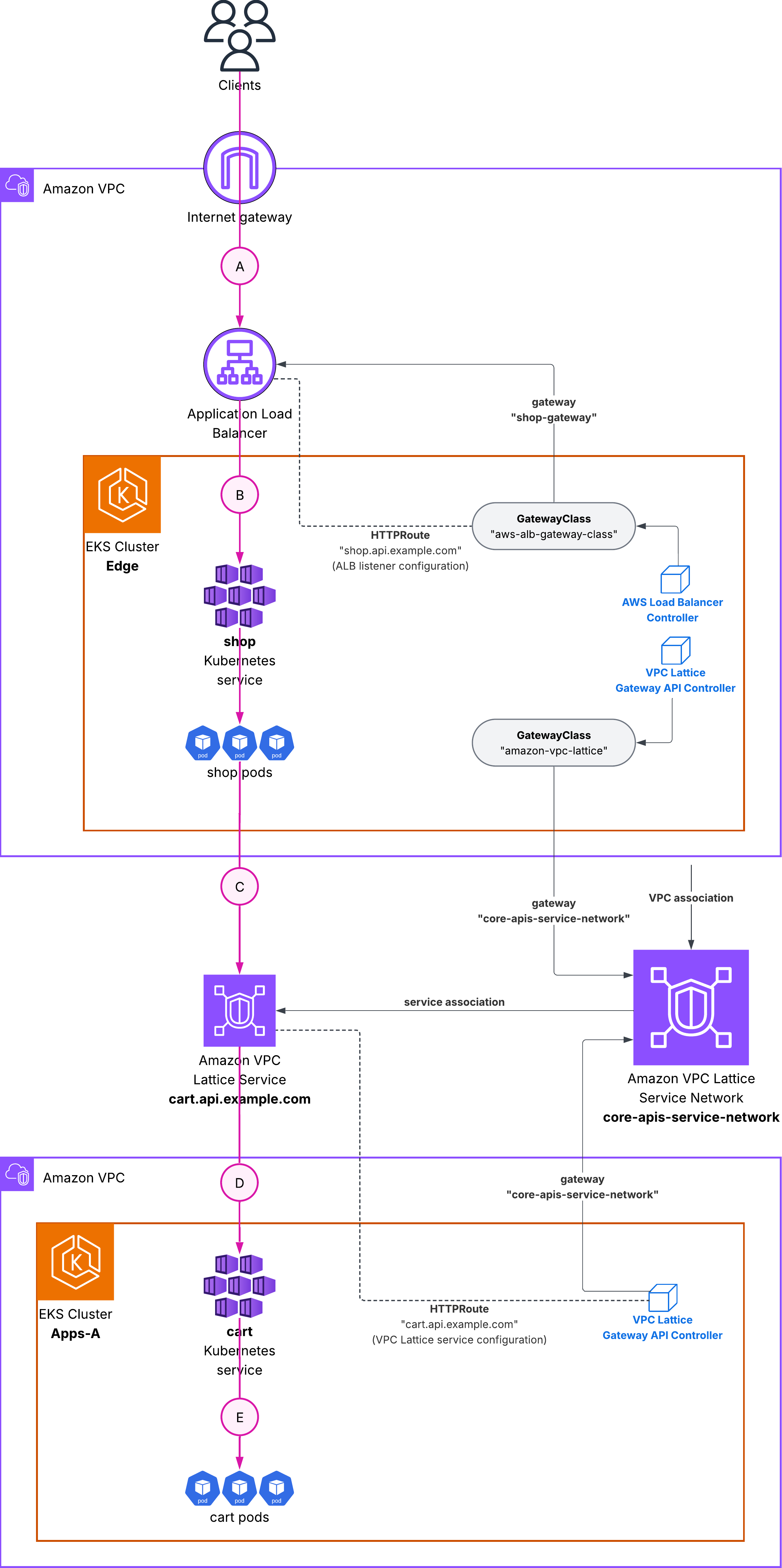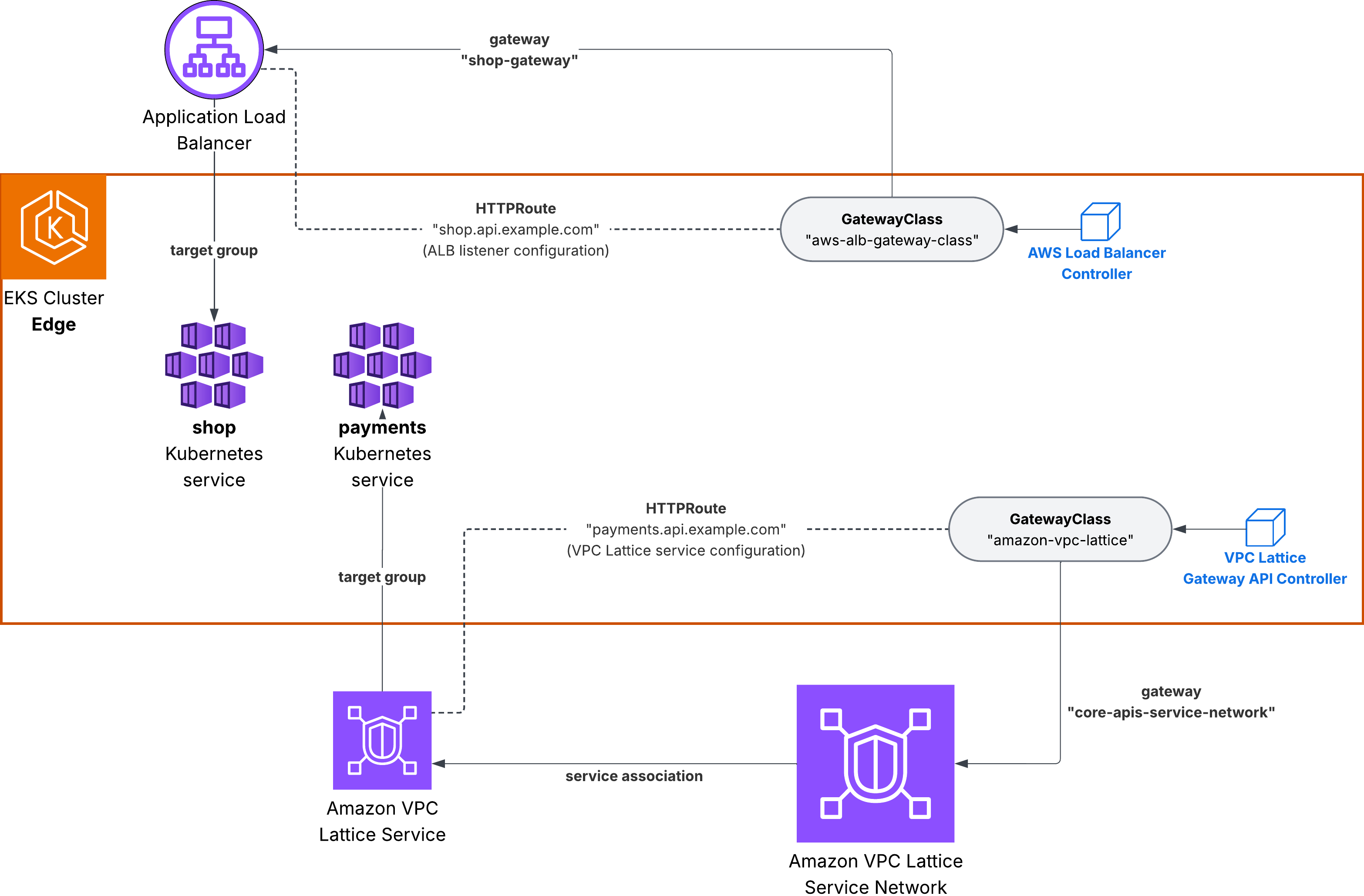 In the architecture shown in figure 2, the Edge cluster uses both controllers simultaneously for complementary use cases: AWS Load Balancer Controller manages the shop.api.example.com service exposed to the internet via ALB, and VPC Lattice Gateway API Controller manages the payments.api.example.com service for internal consumption via VPC Lattice. This demonstrates that both controllers coexist in the same cluster, each managing their respective GatewayClass.