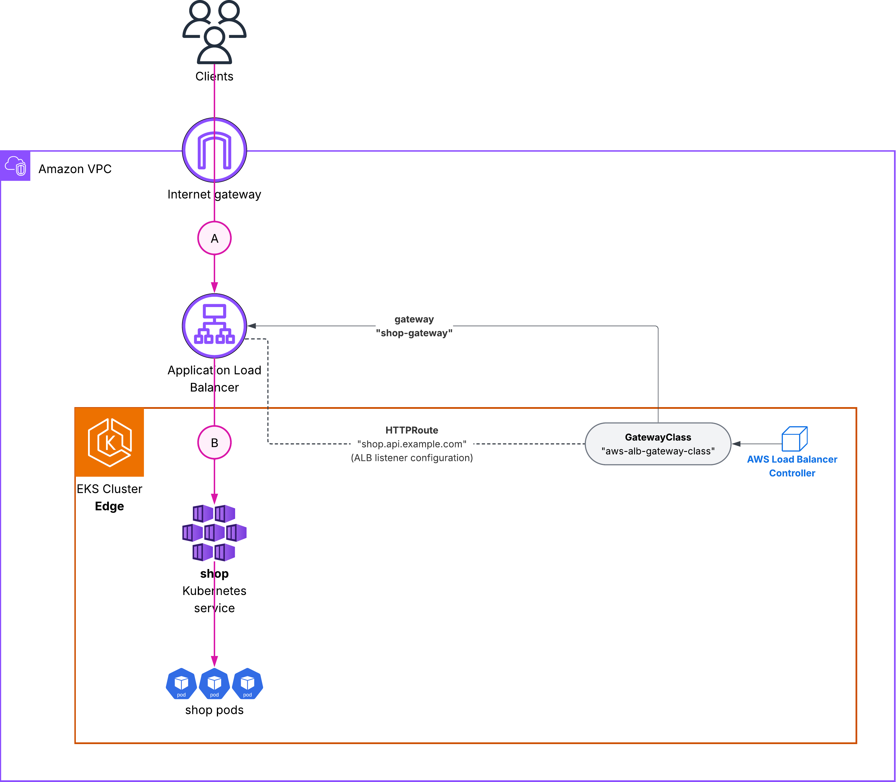 Figure 4 details the internet ingress traffic flow. When an external client sends a request to shop.api.example.com, the Application Load Balancer receives the request and terminates TLS using the certificate provisioned through AWS Certificate Manager (ACM). The ALB then forwards the traffic to the shop pods running in the Edge EKS cluster, using the target group that the AWS Load Balancer Controller automatically configures and keeps in sync as pods scale up or down. The entire flow is managed by the AWS Load Balancer Controller, which watches for changes to the Gateway and HTTPRoute resources and updates the ALB configuration accordingly.