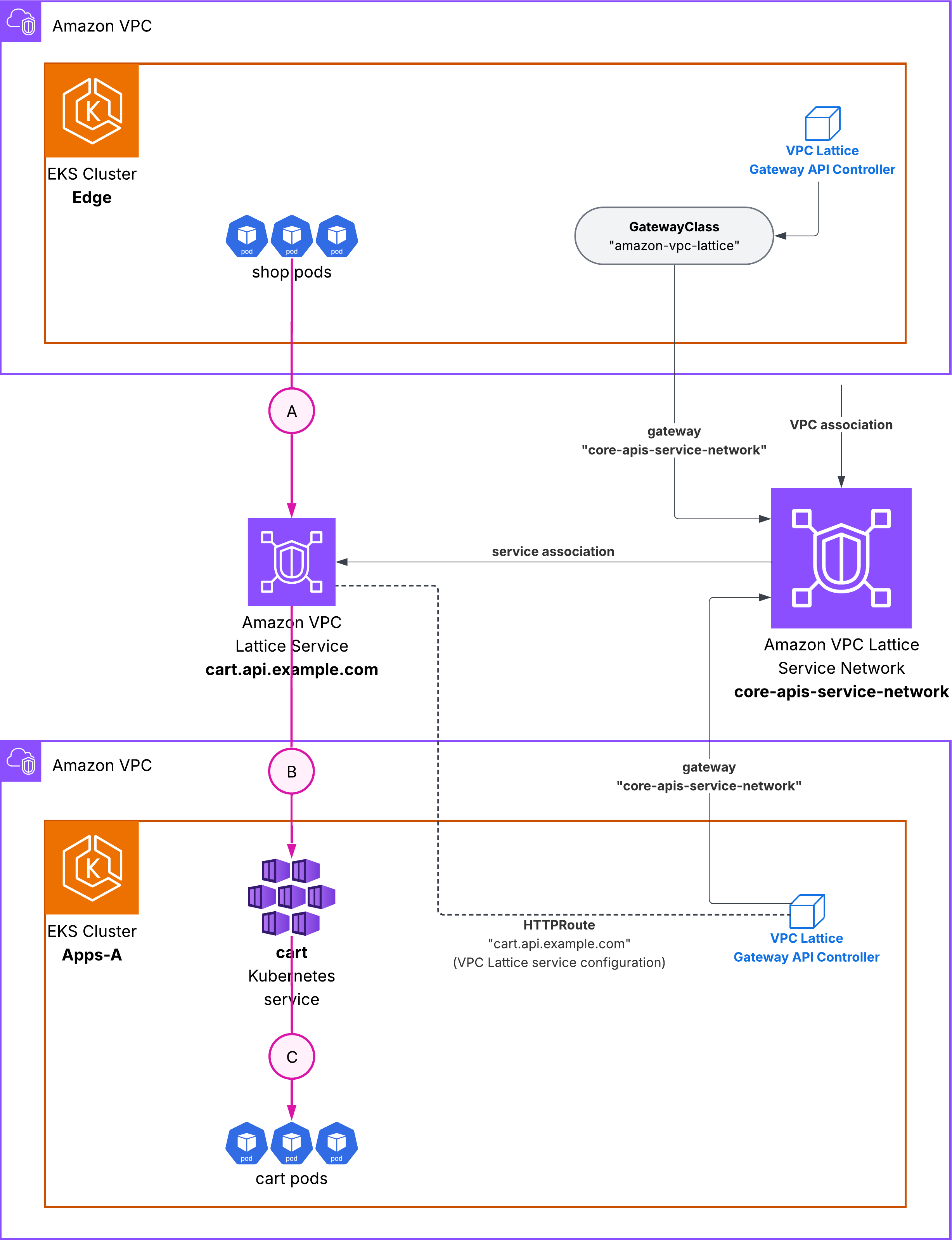 Figure 5 details the cross-cluster traffic flow. When the shop pod calls cart.api.example.com, the request is resolved by VPC Lattice DNS to a VPC Lattice endpoint. VPC Lattice routes the request to the cart service running in Apps-A cluster, without requiring VPC peering, Transit Gateway, or any additional networking configuration. The VPC Lattice Gateway API Controller in each cluster is responsible for registering its services with the shared service network and keeping target groups up to date as pods scale.