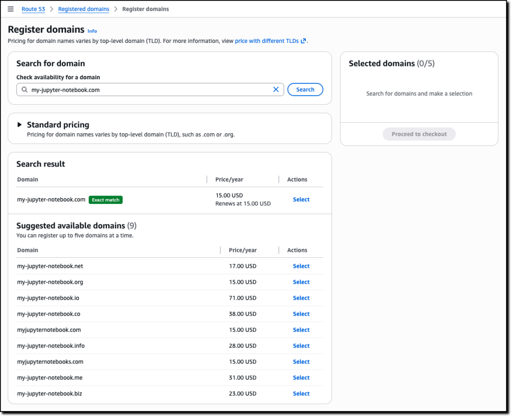 To follow the steps in this post, you need to own a domain and have the ability to create DNS records with Amazon Route 53. If you do not own a domain, you can buy one from Amazon Route 53 console for less than $20 per year. Navigate to Amazon Route53 console. In the navigation pane, choose Domains, then Registered domains and choose Register domains.