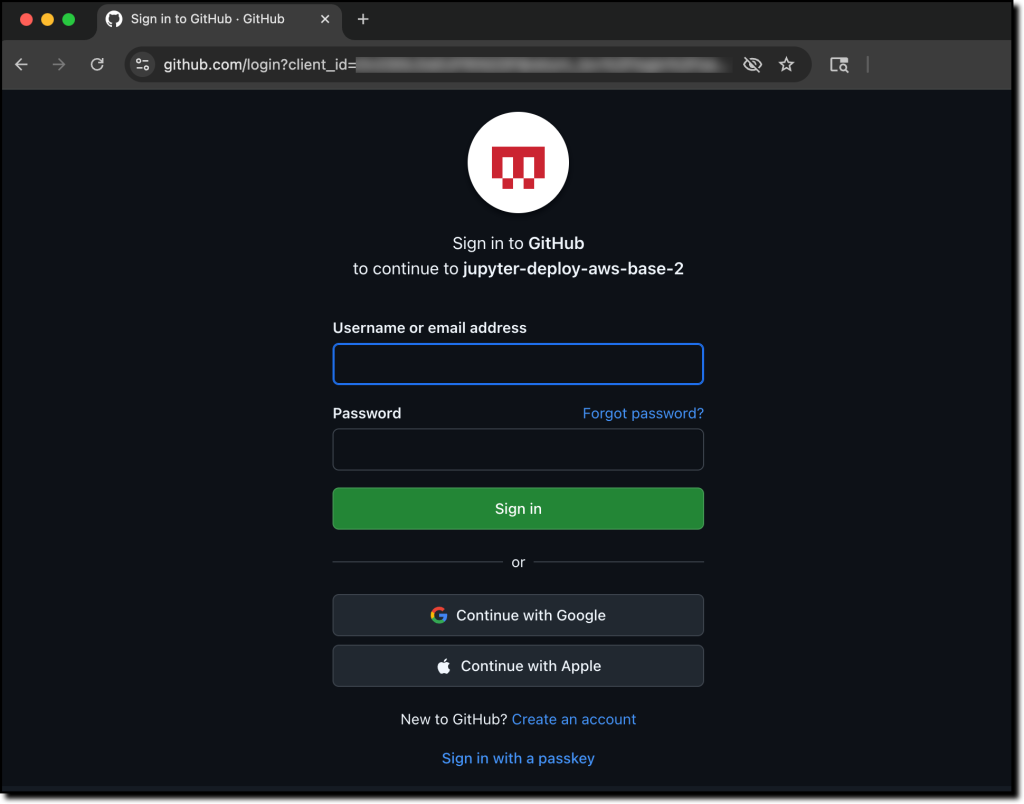 The next step is to set up a GitHub OAuth app. Jupyter Deploy will configure your Amazon EC2 instance to redirect users to GitHub to authenticate by referencing this GitHub app in your GitHub account. If you do not have a GitHub OAuth app yet, follow this link to create one in your GitHub account.