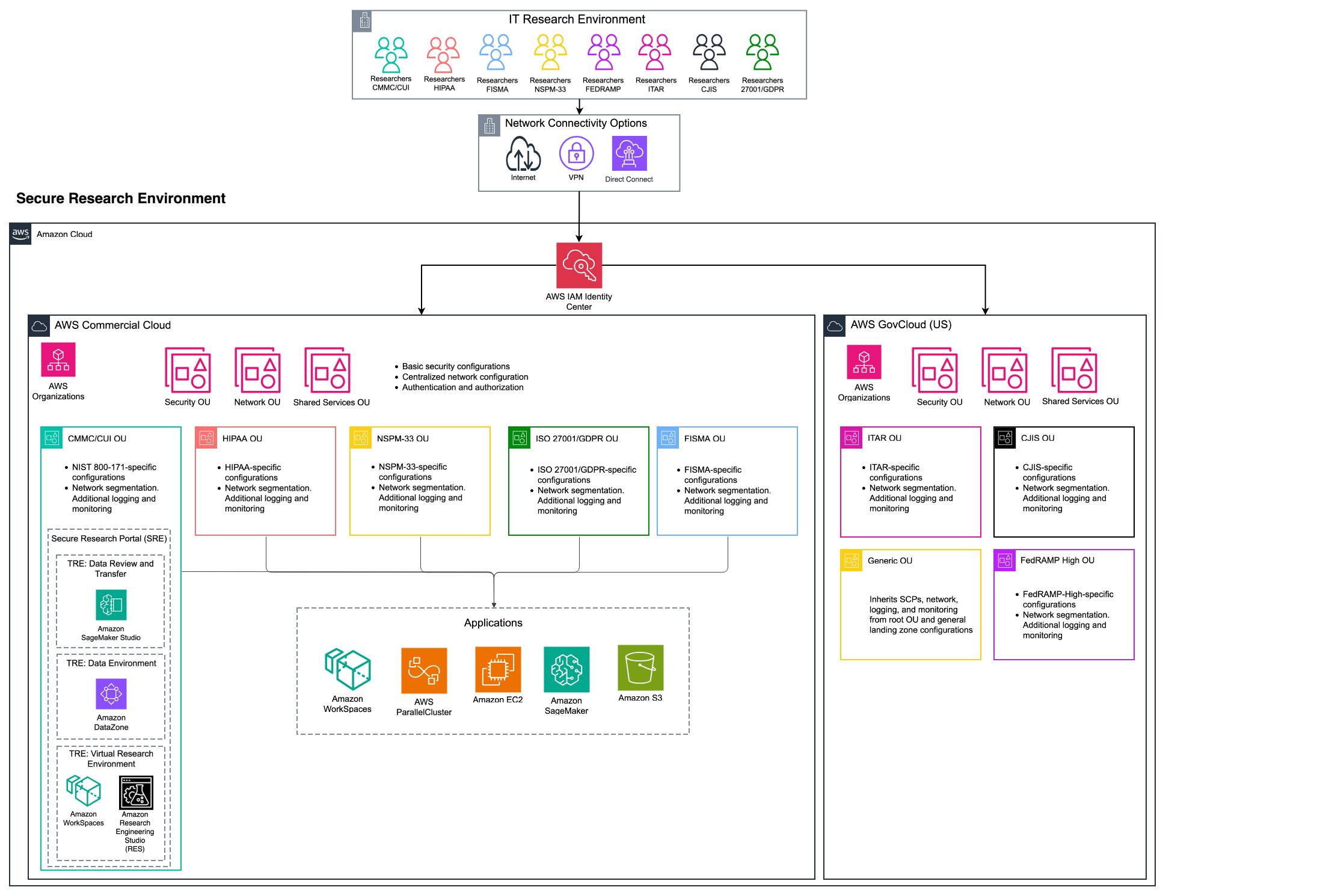 Research institutions worldwide face the same core challenge: meeting rigorous compliance requirements without slowing down scientific discovery. The AWS SRE is built on a flexible, multi-account architecture that can be configured to reflect the regulatory requirements of any jurisdiction, whether your institution operates under a single national framework or navigates overlapping international standards. The SRE provides a consistent, scalable foundation that travels with your research mission.