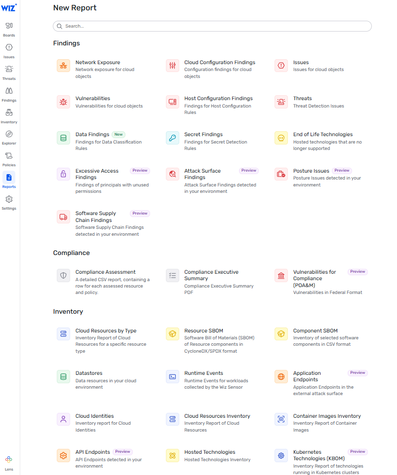 The following image is a screenshot of the Wiz Cloud-Native Application Protection Platform (CNAPP) reports user interface showing findings, compliance, and inventory reports. Underneath each report category are options for report subcategories, including network exposure, vulnerabilities, data findings, compliance assessment, vulnerabilities for compliance, datastores, and cloud resources inventory.