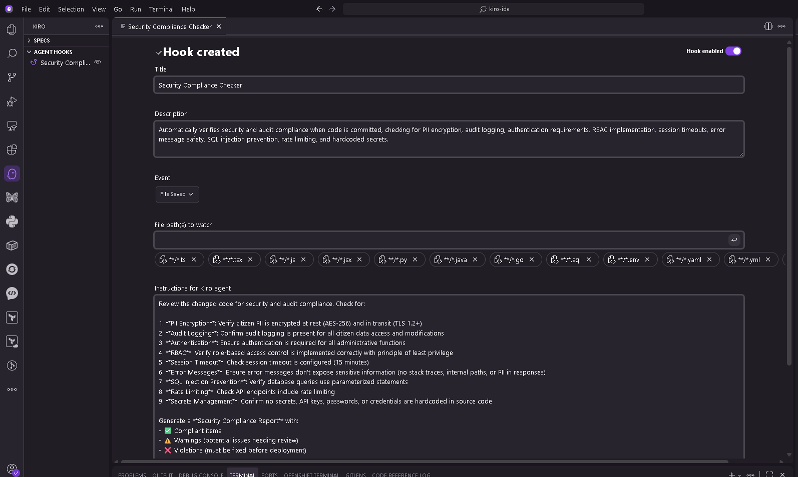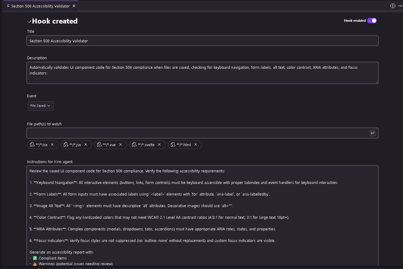 Figure 11: Agent hooks configuration in Kiro