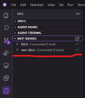 2. Verify the server is active by running /MCP in Kiro to view connected servers or check the MCP status indicator in the Kiro interface.