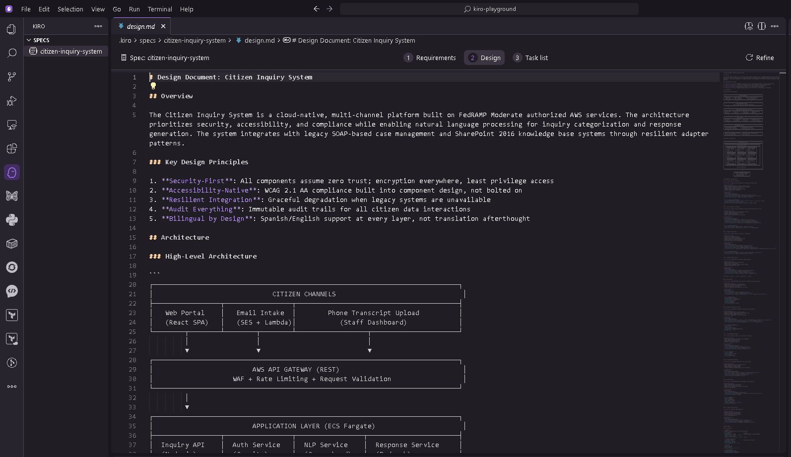 2. Enter your requirements in natural language, including compliance mandates, functional requirements, and security controls. The following example shows a spec input for a citizen inquiry system: