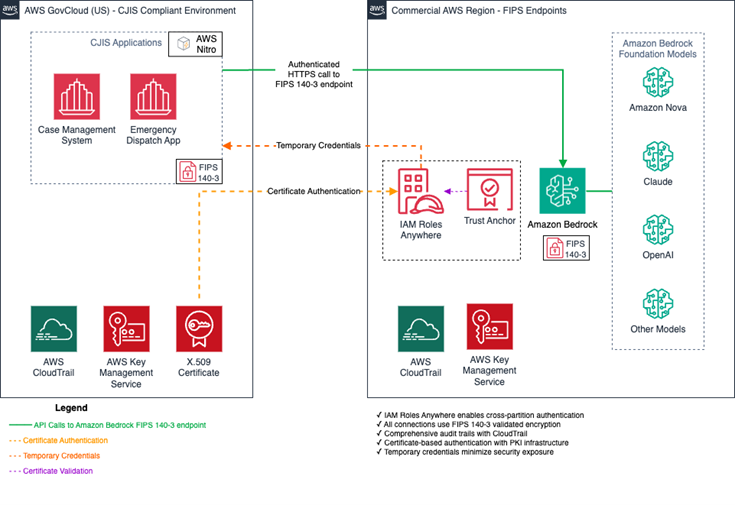 While Criminal Justice Information Services (CJIS)-compliant workloads can run in standard US AWS Regions, some Justice and Public Safety (JPS) agencies may choose AWS GovCloud (US) for their sensitive workloads. These organizations can securely access cutting-edge Artificial Intelligence (AI) models from AWS Standard US Regions through FIPS-validated endpoints ensuring that all data is securely encrypted with FIPS 140-3 encryption as required by CJIS. This access may allow you to maintain CJIS compliance based on your organization’s secure cross-partition connectivity implementation. You should always review and validate a solution against your compliance goals.