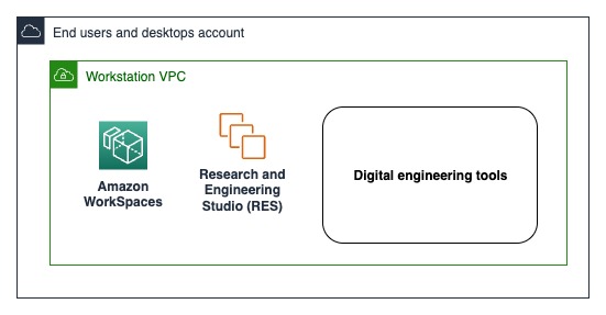 The end users account provides virtual desktop infrastructure (VDI) that delivers role-based secure access to digital engineering tools and resources. With VDI, users can access powerful computing resources and specialized applications from any location while maintaining strict security controls. With account separation, VDI resources connect securely to cross-account services such as the shared services account without giving users direct access to the underlying infrastructure.