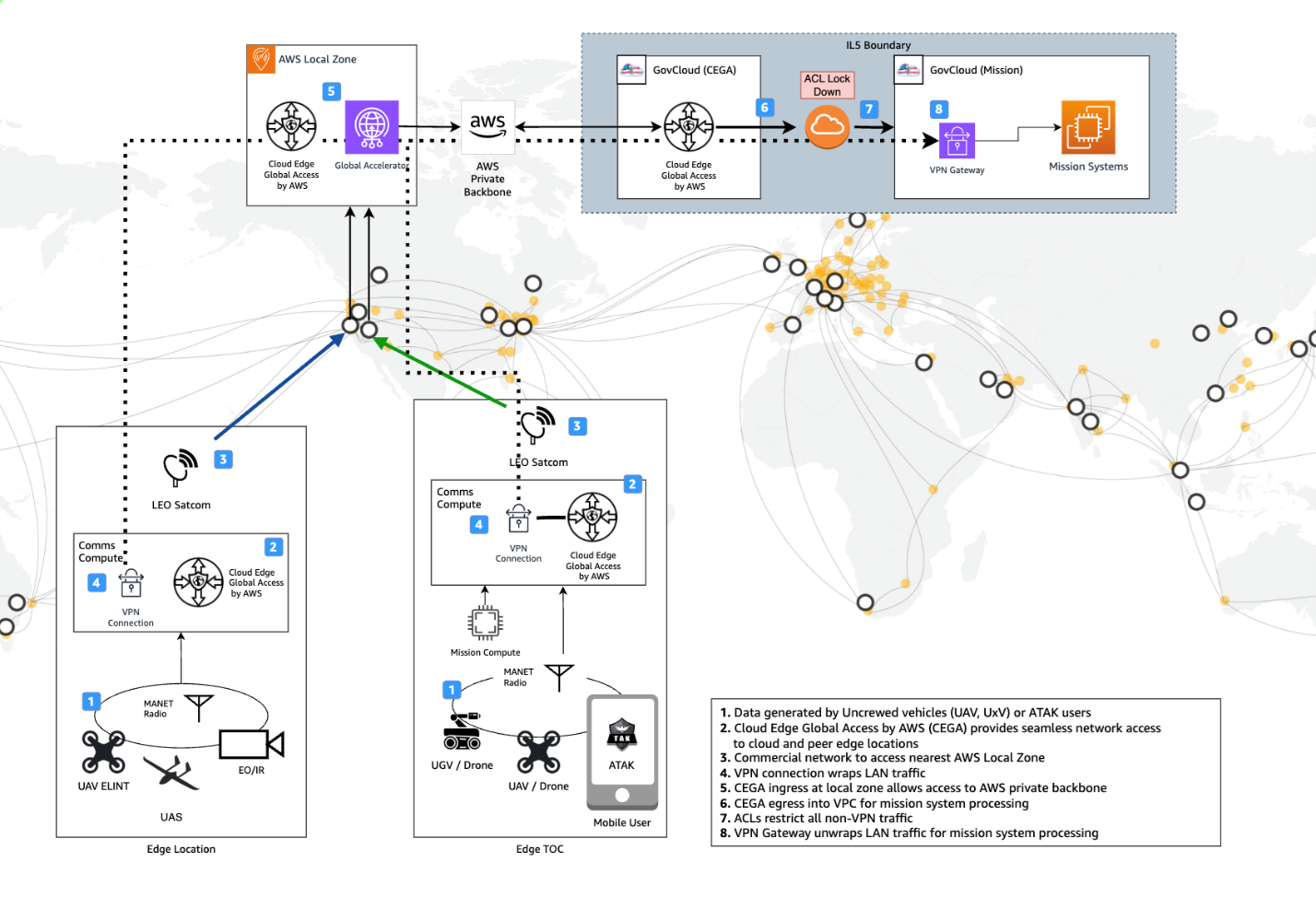 Figure 1. Architecture diagram showing how AWS Cloud Edge Global Access (CEGA) enables secure cross-domain data flow for military operations.