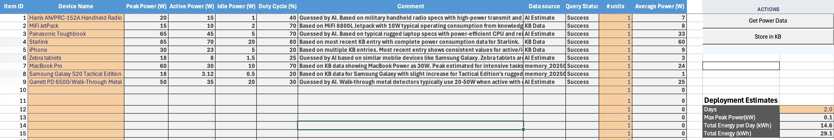 Working with Sentient, the AWS engineers have developed a Power Consumption Knowledge Base System supporting tactical missions. When using this solution, you can obtain power data from a rich knowledge base and can also upload notes from the field to expand the knowledge base using a spreadsheet environment.