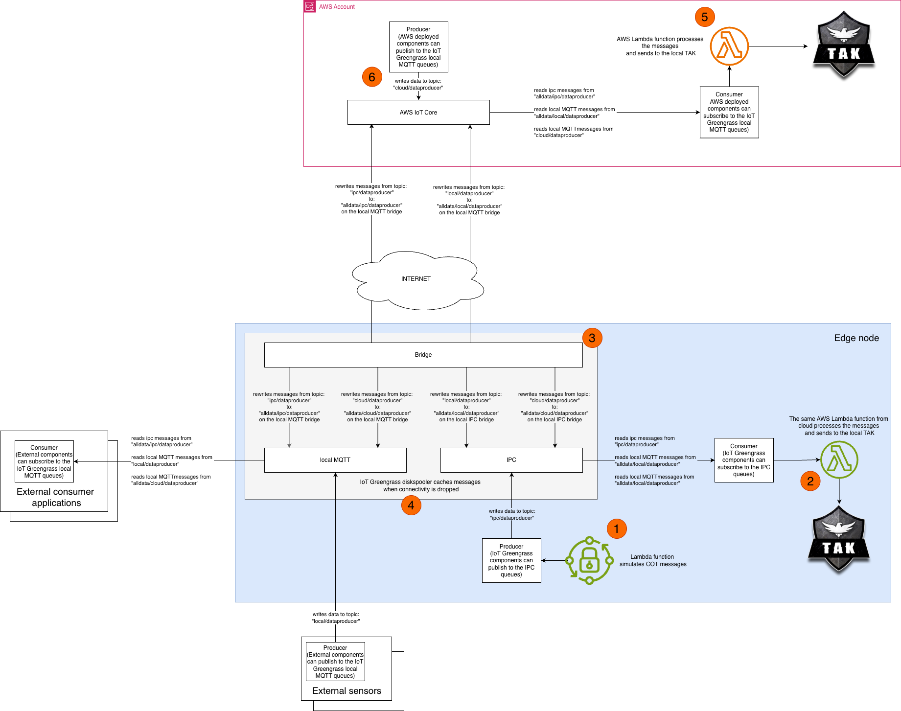 - Locally deployed AWS Lambda processor (using the same code as the Lambda function running in the cloud) processes the message messages from the IPC queue and pushes it into TAK.
