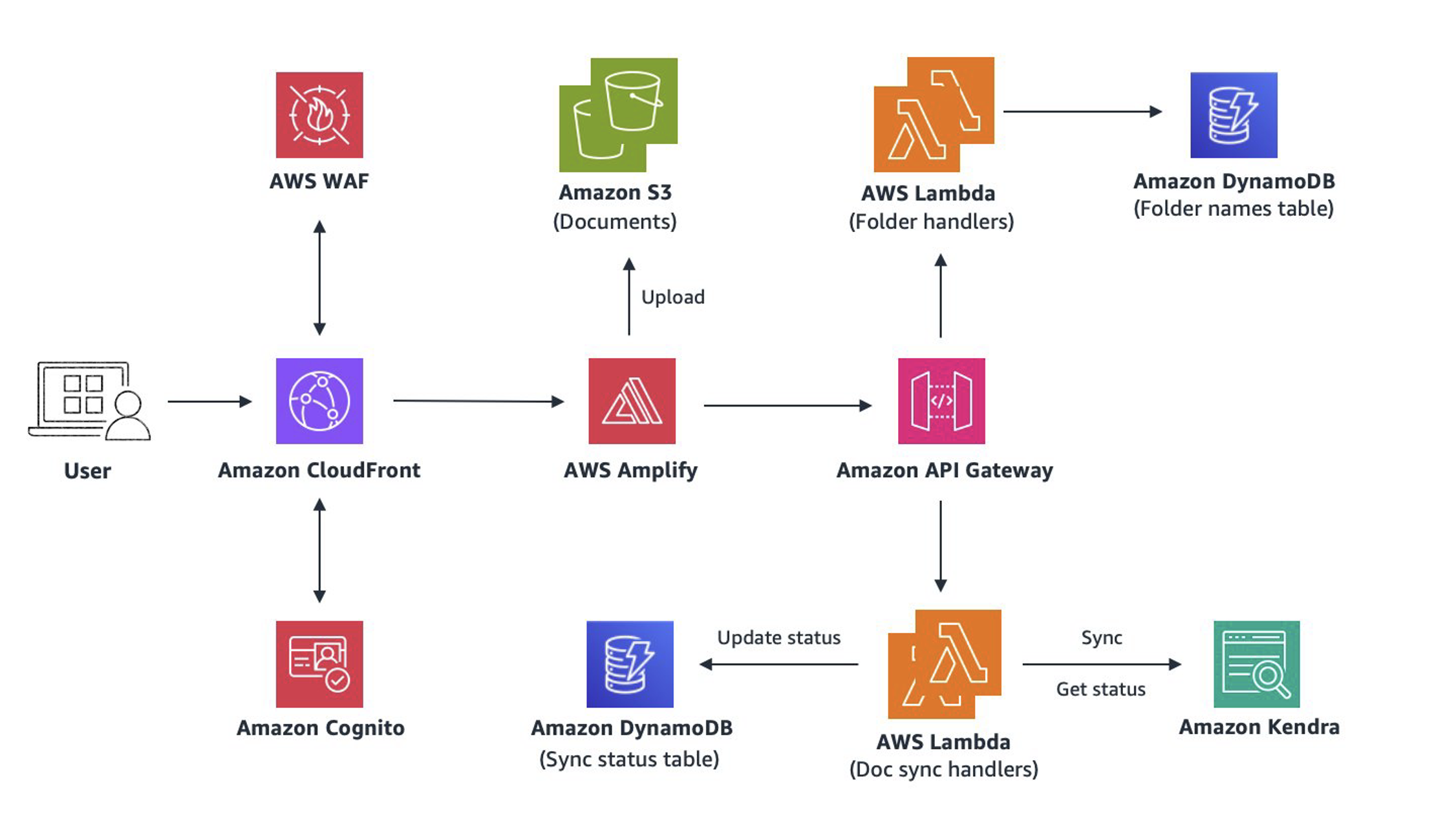 Admin users can upload new documents through the chat interface. AWS Lambda functions, triggered by API Gateway, manage document folder listings and metadata storage in Amazon DynamoDB. When new documents are uploaded, users can initiate Amazon Kendra sync jobs to index the new data. This process involves multiple Lambda functions working in concert with DynamoDB and AWS Step Functions to track and manage the sync job status. Amazon Kendra is used to index and search documents, making sure that relevant information can be quickly retrieved during chat interactions. As an intelligent search service powered by machine learning, Amazon Kendra is specifically designed for retrieval-augmented generation (RAG) applications, enabling natural language understanding and semantic search capabilities that go far beyond traditional keyword matching.