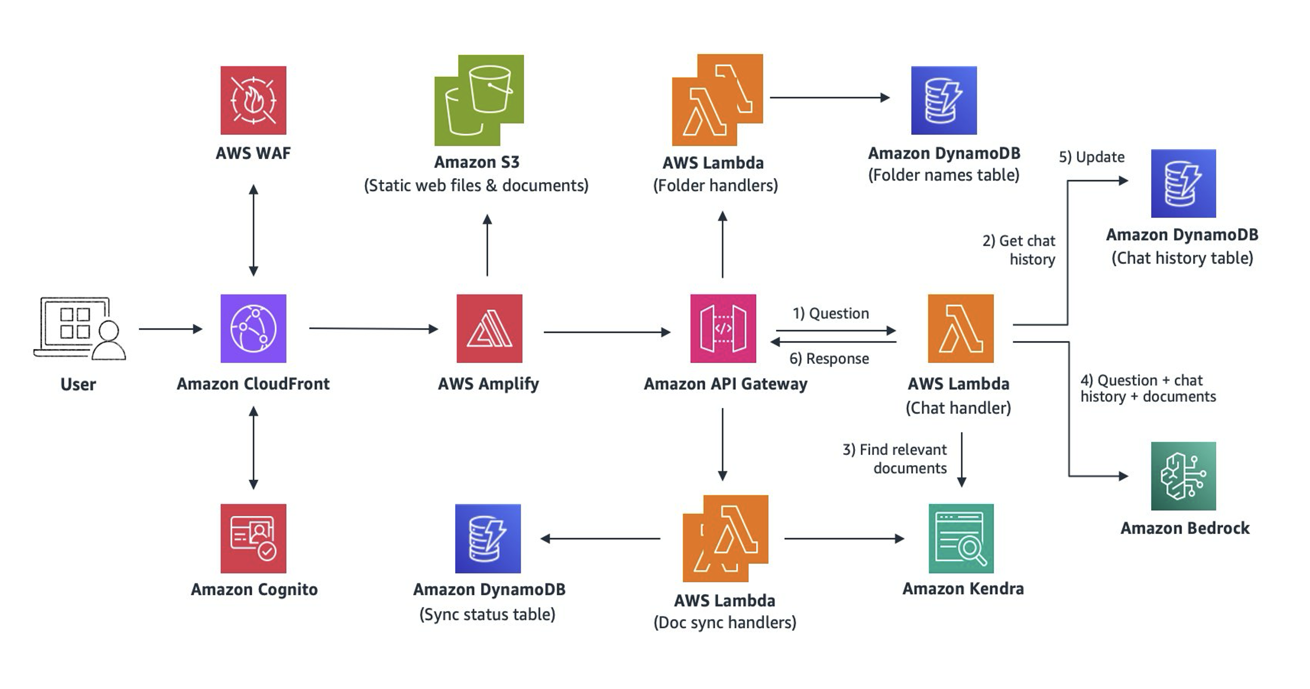 The core of the application is its chat interaction functionality, using the integration of Amazon Kendra with Amazon Bedrock. When a user asks a question, it triggers a series of Lambda functions. These functions retrieve conversation context from DynamoDB and query Amazon Kendra for relevant documents based on user permissions. The user’s question, along with the conversation history, chosen language, and relevant document information, is then sent to Amazon Bedrock for processing. Amazon Bedrock, using advanced language models, generates contextually appropriate responses. The question-answer pairs are stored in DynamoDB for future context, and the response is returned to the front-end through API Gateway.