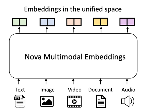 Most existing embedding models are built for only one or two modalities. This forces organizations to maintain multiple separated embedding systems without a way to align or map data across different content types, leading to data silos. Amazon Nova Multimodal Embeddings creates a unified vector space combining text, images, complete document pages, video and audio—enabling direct comparisons using standard similarity measures. The following graphic illustrates Nova Multimodal Embeddings in the unified space.