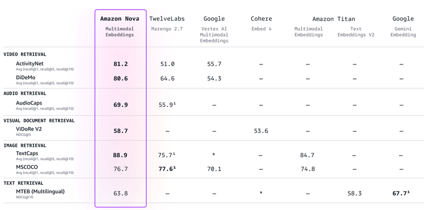 Figure 3: Amazon Nova Multimodal Embeddings performance comparison with selected available enterprise embedding models