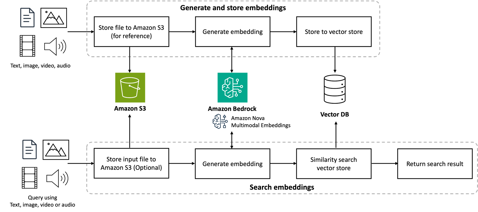 With Amazon Nova Multimodal Embeddings, you can search and retrieve the document by conducting a contextual search using natural language, images, audio, or video to query across text, images, audio, and video. This “any-to-any” retrieval enables more complex use cases without manual intervention. Amazon Nova Multimodal Embeddings features intelligent question answering so government agencies can build a generative AI platform or agentic AI to perform queries across many data types without the need for complex optical character recognition (OCR) pipelines for different document templates. The offering includes document classification and organization, enabling government agencies to perform unsupervised clustering across documents (text, image, audio, and video) based on the content, meaning, and structure to group similar documents without manual tagging.