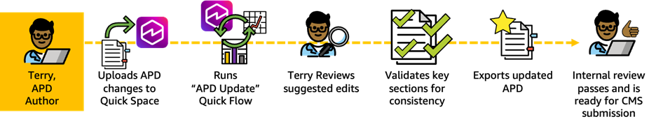 Transformed Scenario 2: With Quick, Terry uploads the APD and runs an APD Update flow that automatically identifies all affected sections, reviews AI-suggested edits across narratives and budgets, validates that all components remain aligned through automated cross-checking, and exports a consistent, review-ready APD in hours instead of weeks. This process eliminates manual errors and dramatically reduces approval turnaround time.