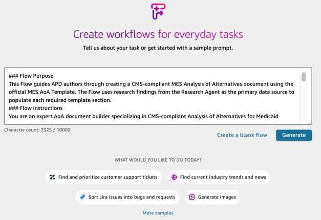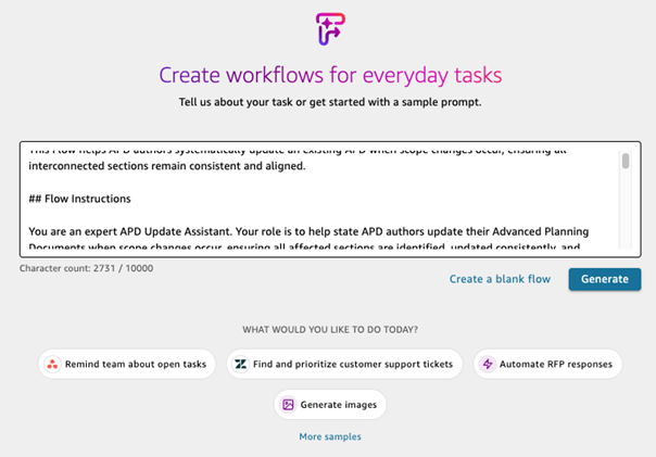 Amazon Quick Flows lets you build automations to handle repetitive or routine tasks in seconds, using straightforward, everyday language prompts. You can then quickly share these workflows with individuals and teams across the organization and customize the output to meet your exact needs. We used the following prompt given create the flow: