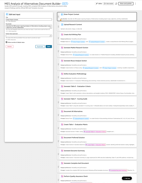 In each case, Quick Suite addresses the core inefficiencies that have long plagued APD authors. By eliminating manual data extraction from 50–80 page documents, automating budget calculations and consistency checks, providing AI-powered research capabilities that replace weeks of manual investigation, and validating regulatory compliance before submission. As a result, APD authors shifted their focus from wrestling with documentation mechanics to what truly matters: crafting compelling, compliant funding requests that secure federal approval on the first cycle.