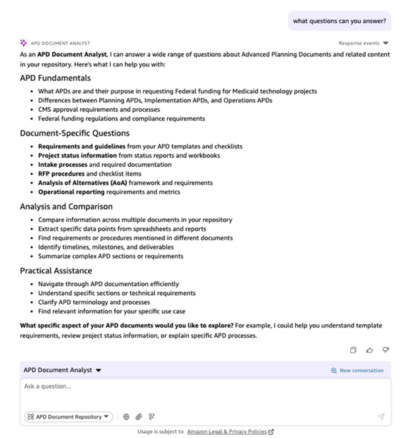 Transformed Scenario 1: With Quick Suite, Jane transforms this multiday ordeal into a same-day success by using conversational AI to query a centralized APD space. Instead of searching through disconnected files, she asks natural language questions and receives consolidated, accurate data instantly. The ability to ask iterative follow-up questions and export comprehensive reports means María can respond to urgent leadership requests within hours rather than days, delivering the reliable portfolio visibility that Medicaid directors need to make informed decisions about federal funding and project priorities.