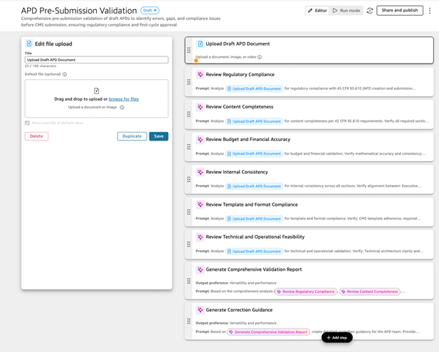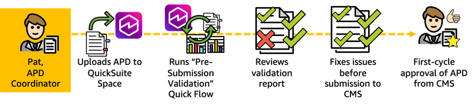 Transformed Scenario 4: With Quick Suite, Pat’s workflow is transformed. After completing his draft IAPD, he uploads it to a Quick Suite space, where it’s indexed and ready for validation. He runs the presubmission validation flow, which systematically checks regulatory compliance, budget math, scope alignment, and template completeness. Within minutes, he reviews a validation report that flags three specific issues: a budget calculation error, a missing CEF attestation, and inconsistent activity dates. Pat corrects all flagged items in only 30 minutes and CMS approves the IAPD without questions on the first cycle, keeping the project on schedule and avoiding costly delays.