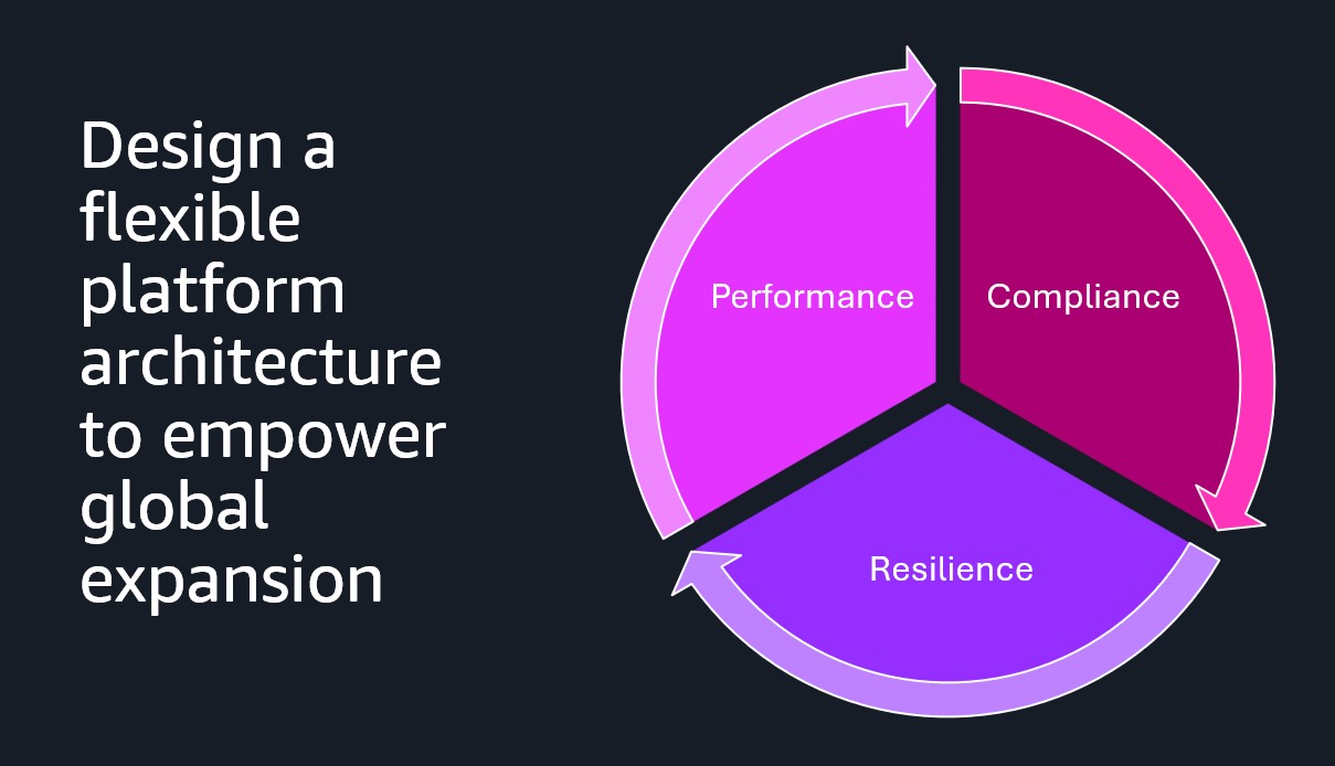 For effective and efficient global expansion, AWS Partners need to design a flexible platform architecture that can meet the requirements of their users in different geographic regions and industries. These requirements typically fall into three categories: performance, compliance, and resilience. The design is a balance between these three dimensions and agility and cost to maintain the platform. The following graphic illustrates this.