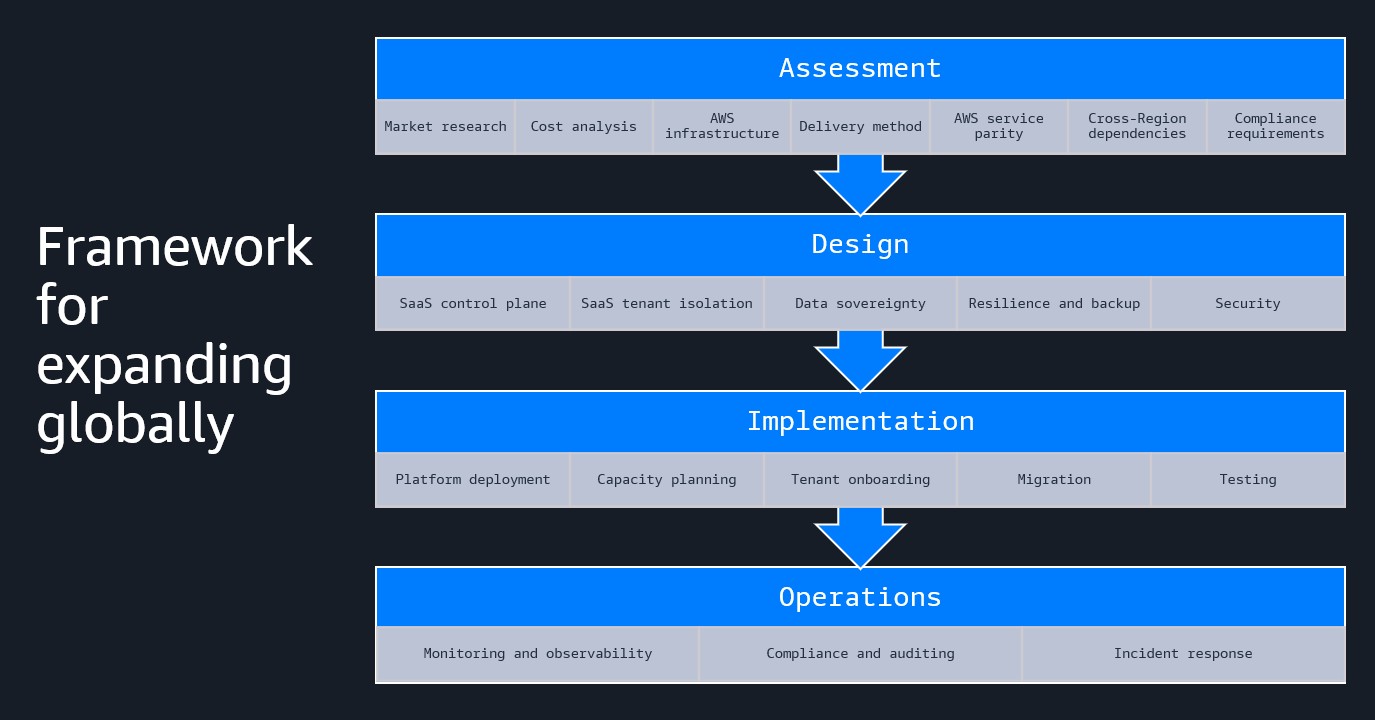 We propose a four-stage framework for partners to expand their platforms successfully into new geographical regions: assessment, design, implementation, and operations. The assessment phase covers market research, cost analysis, compliance requirements, cross-Region dependencies, and analysis of AWS Global Infrastructure and services to guide the delivery method. The design stage involves architecting a flexible platform to reduce speed to market while meeting user requirements in a cost-effective way. This covers SaaS control plane, tenant isolation, data sovereignty, resilience and backup, and security. Implementation is focused on having an efficient deployment and tenant onboarding process, and it includes capacity planning, migration, and testing. Finally, the operations phase is indexed on automating operations. This includes monitoring and observability, compliance and audit reporting, and incident response.