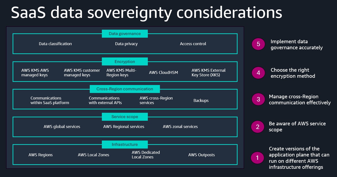 The following diagram shows the key data sovereignty considerations covering infrastructure, AWS service scope, cross-Region communication, encryption, and data governance.