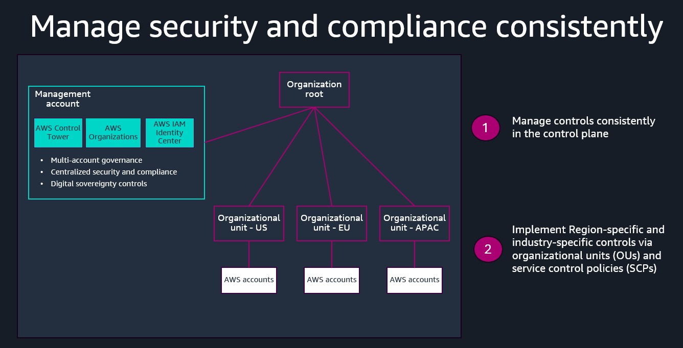 The final recommendation for platform design is to manage security and compliance consistently across your AWS accounts to meet requirements specific to countries and industries. For this, we suggest using AWS Organizations to create an organization hierarchy by geographical region and country, and potentially by industry and regulation. Under the organization root, you create multiple organizational units (OUs) that contain AWS accounts. A separate management account is used for multi-account governance, centralized security and compliance, and implementing digital sovereignty controls using AWS Control Tower across all accounts. And you can implement controls specific to OUs using service control policies (SCPs).