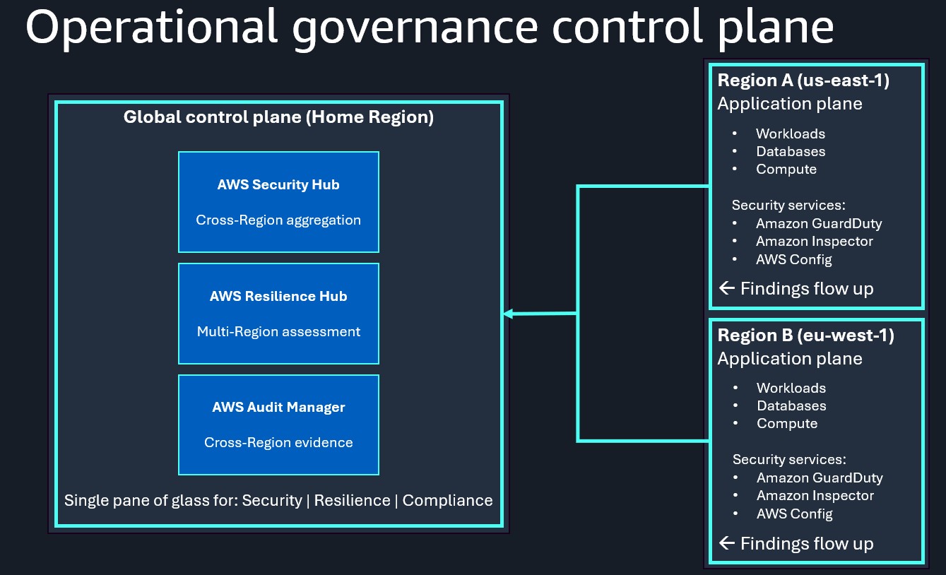 These services form an interconnected governance framework. Security Hub findings become evidence in Audit Manager assessments, Resilience Hub validates that security controls won’t compromise recovery objectives, and Audit Manager proves both security and resilience policies are consistently applied. Without this centralized approach, each new Region multiplies governance complexity. Aggregating into a central control plane simplifies governance and reduces the validation time needed to onboard customers in new Regions.