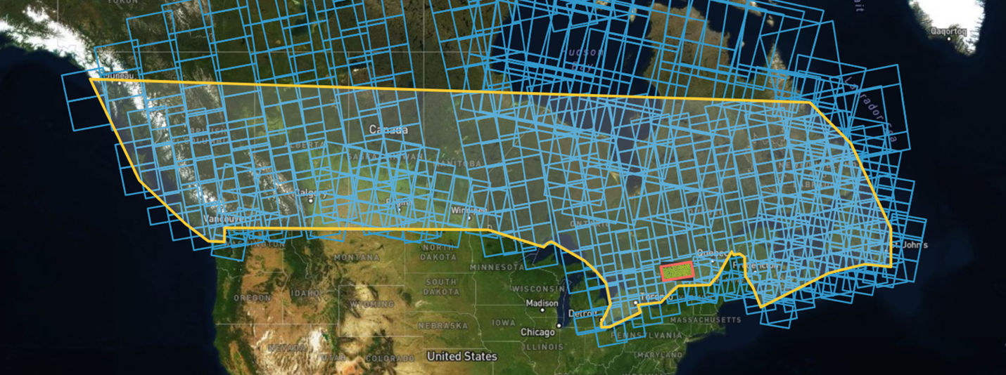 Figure 1: Areas of interest (AOIs) across Canada for Sentinel-1 data. PoC region in Ontario highlighted